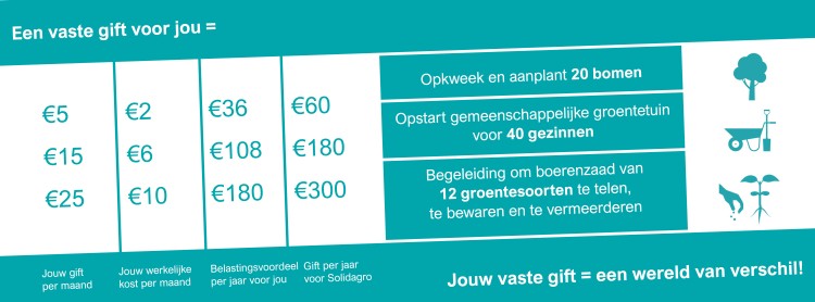 Je kan jouw gift ook spreiden met een doorlopende opdracht. Voor 5 euro per maand schenk je 60 euro aan Solidagro en krijg je 36 euro terug van de belastingen. Zo kost deze gift je slechts 2 euro per maand.